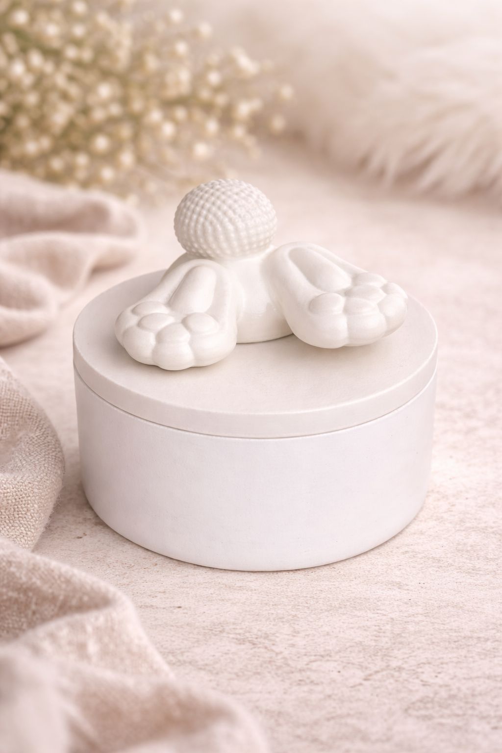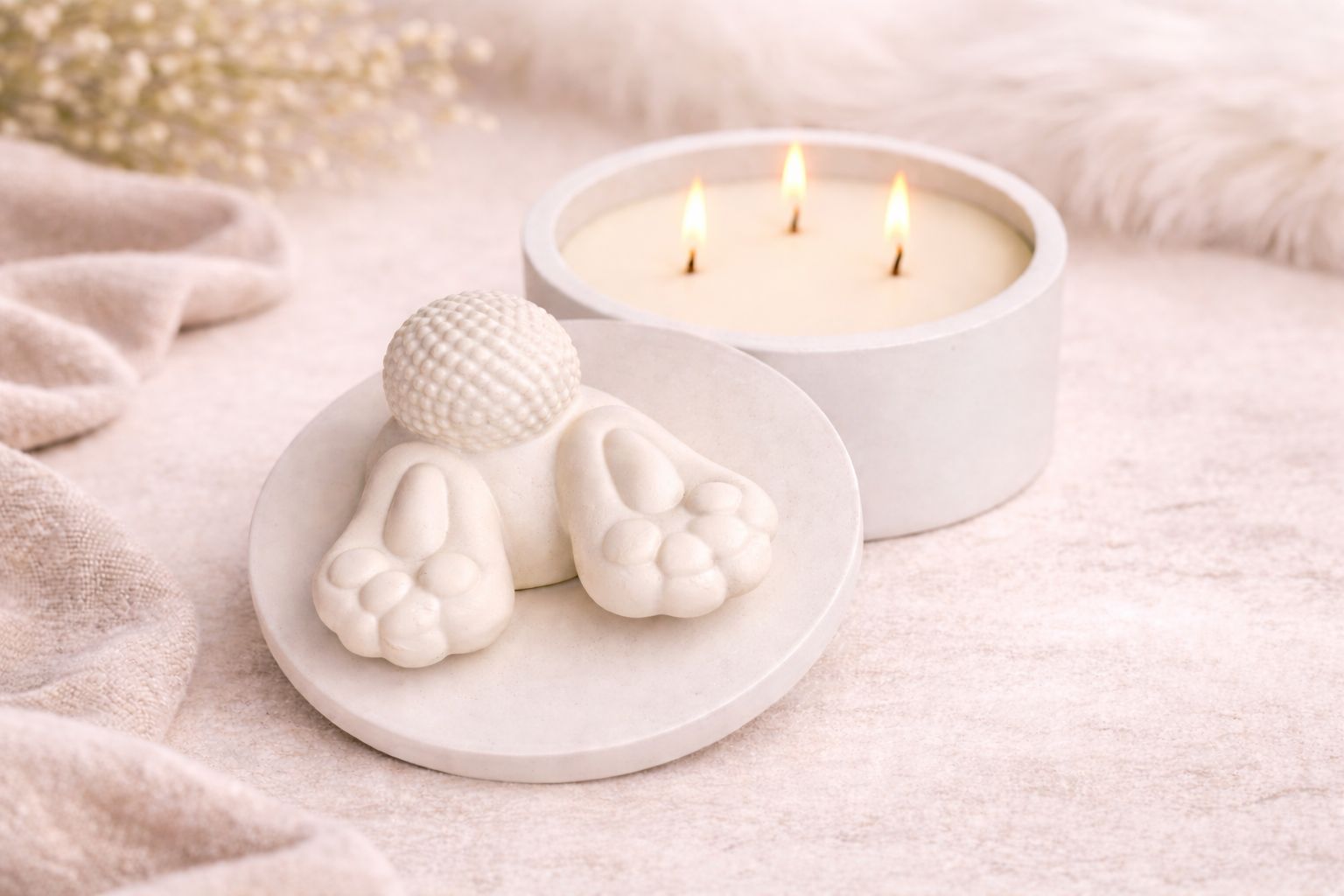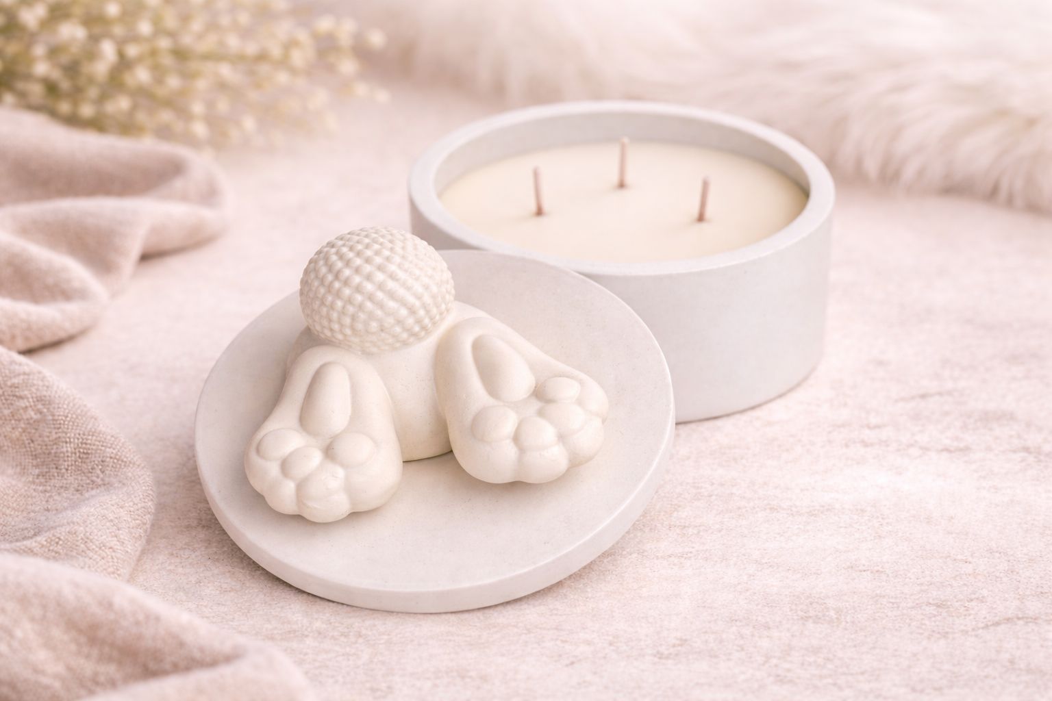 Une bougie artisanale pleine de douceur, où les petites pattes et la queue de lapin semblent plonger délicatement dans le couvercle.