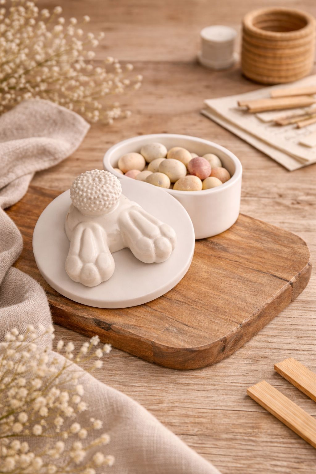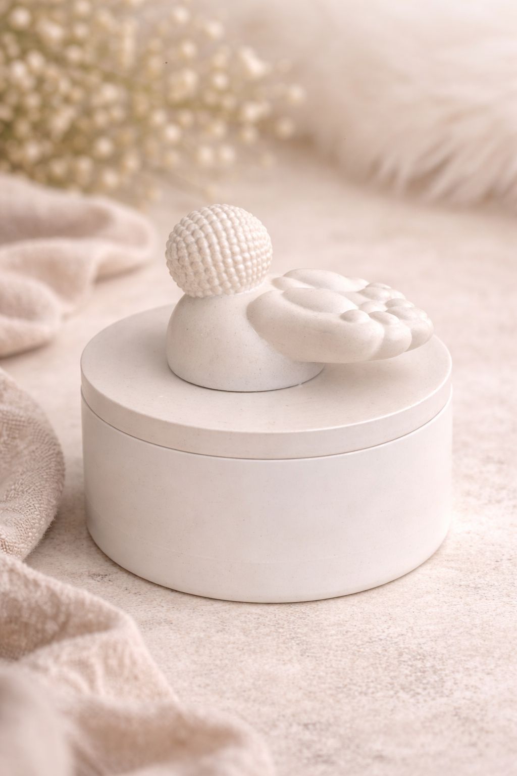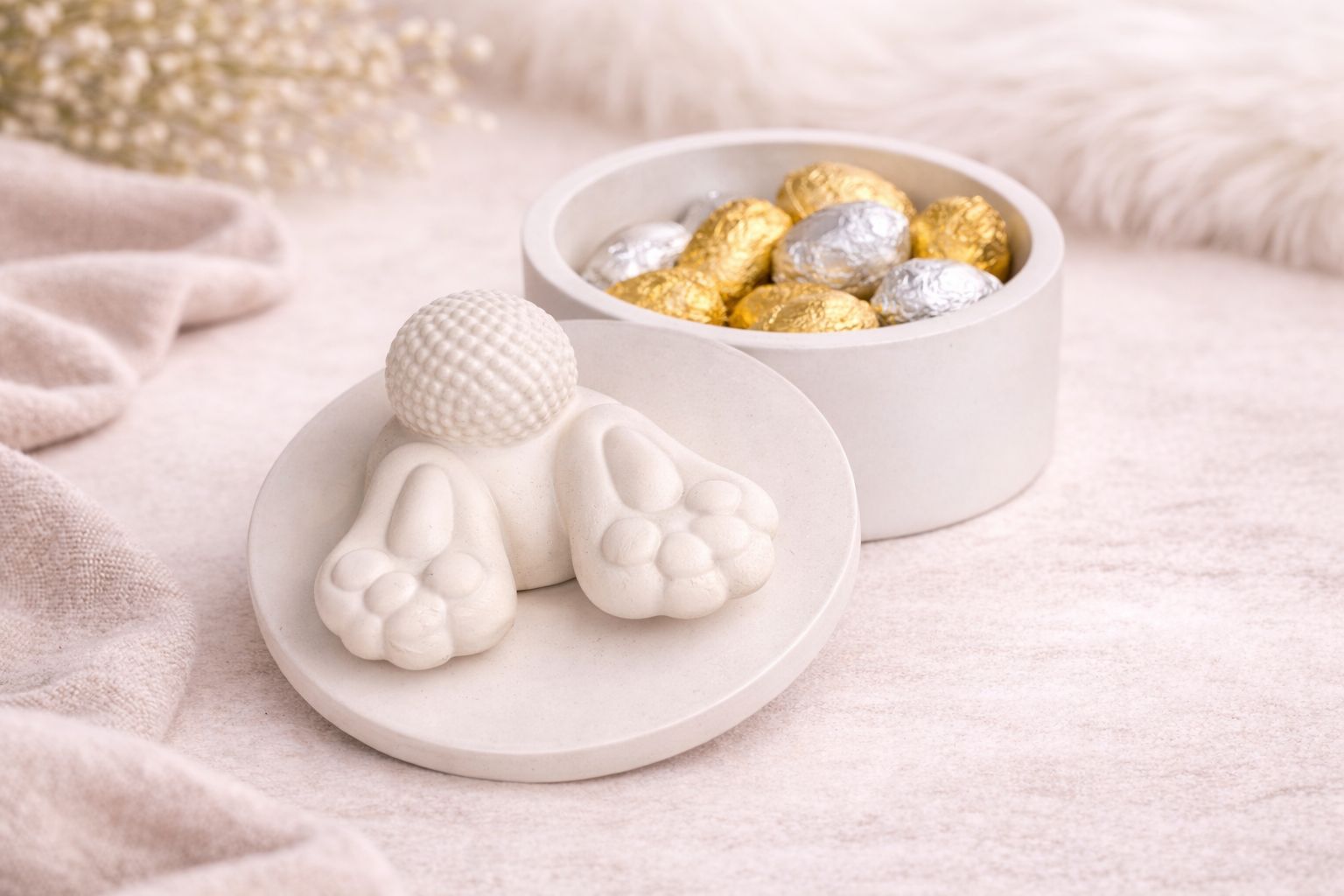 Une bougie artisanale pleine de douceur, où les petites pattes et la queue de lapin semblent plonger délicatement dans le couvercle.